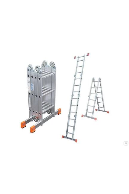 Трансформируется в лестницу, подмости и платформу. Высота площадки 150 см. Легкий алюминий, нагрузка до 150 кг. Шарнирная система для безопасности.