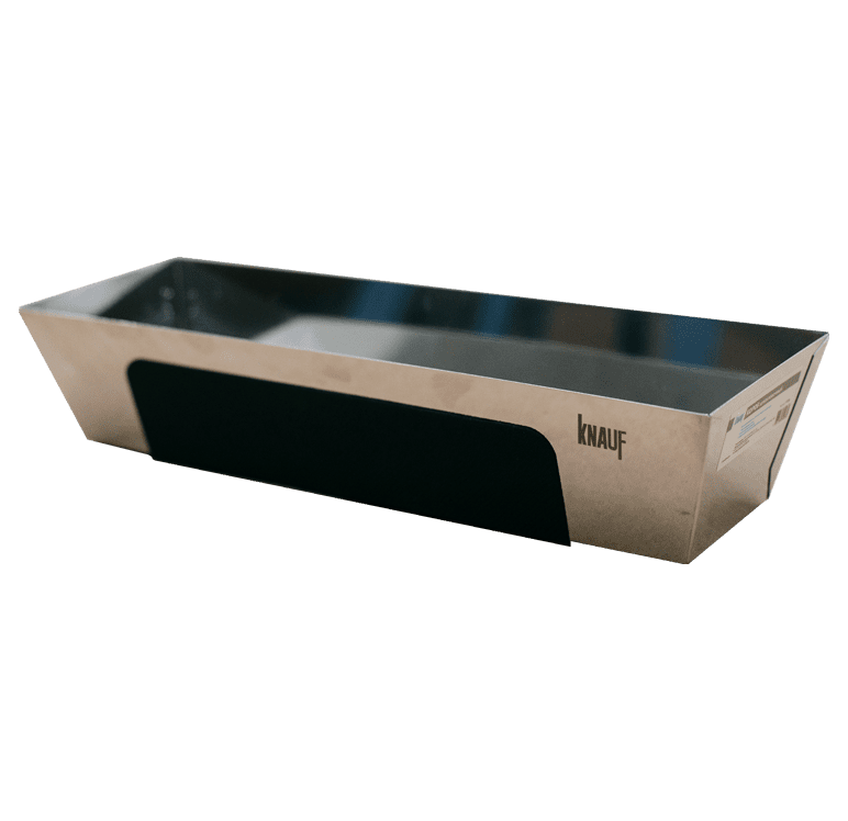 Короб / ванночка для шпатлевки КНАУФ из нержавеющей стали - применяется для замешивания шпаклевки. Емкость из нержавеющей стали для замешивания шпаклевки позволяет затворять и обрабатывать шпаклевку в оптимальном для шпаклевания швов количестве. Короб удобно держать в одной руке благодаря его форме, размеру и прорезиненной подложке. Вытянутая форма короба для шпатлевания КНАУФ позволяет равномерно забирать раствор шпателем и качественно наносить его на поверхность. Острые края короба Knauf позволяют очищать шпатель об них. Материал шпаклевочного короба КНАУФ – нержавеющая сталь, что увеличивает срок использования данного изделия, а также исключает следы попадания от ржавчины в раствор, как если бы это было обычное железо. Нержавеющий корпус, плавное нанесение шпаклевки, удобно держать, износостойкий, легко чистится, подходит для любых типов поверхностей.