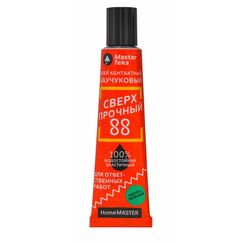 Клей контактный каучуковый MasterTeks HomeMaster 88 сверхпрочный ПРЕИМУЩЕСТВА: ● Усиленная адгезия; ● 100% водостойкий; ● Эластичный; ● Теплостойкий; ● Морозостойкий. ОБЛАСТЬ ПРИМЕНЕНИЯ: ● Склеивает в любом сочетании резину, кожу, кирзу, ткань, поролон, бумагу, картон, пластик, стекло, керамику, металл, дерево, бетон. Не рекомендуется для ПП, ПЭ, тефлона. Условия применения: на очищенные поверхности равномерно нанести тонкий слой клея. Подсушить и плотно прижать. Для ответственного крепления рекомендуется нанесение второго слоя клея через 5-10 минут после первого. Склеенным изделием можно пользоваться через 12 часов. Температура применения: от +10°C до +30°C. Термостойкость: от -40°C до +80°C. Сверхпрочный каучуковый клей 88: быстрый, эластичный, влагостойкий, для металла, резины, кожи, пластика, дерева и других материалов.