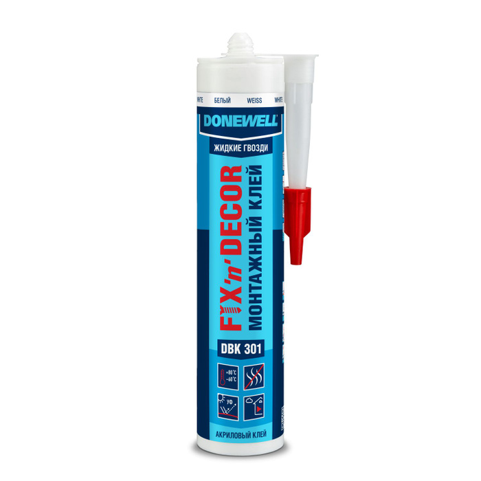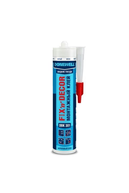 Высококачественный универсальный акриловый клей DONEWELL® FIX‑N‑DECOR специально разработан для приклеивания изделий из древесины, ДСП, ДВП, EPS, XPS и UPVC на бетонные, кирпичные, каменные, металлические, оштукатуренные и деревянные поверхности. Идеально подходит для сборки деревянных конструкций, приклеивания гипсокартона, OSB‑плит, декоративных элементов, подоконников, утеплителей различных видов.