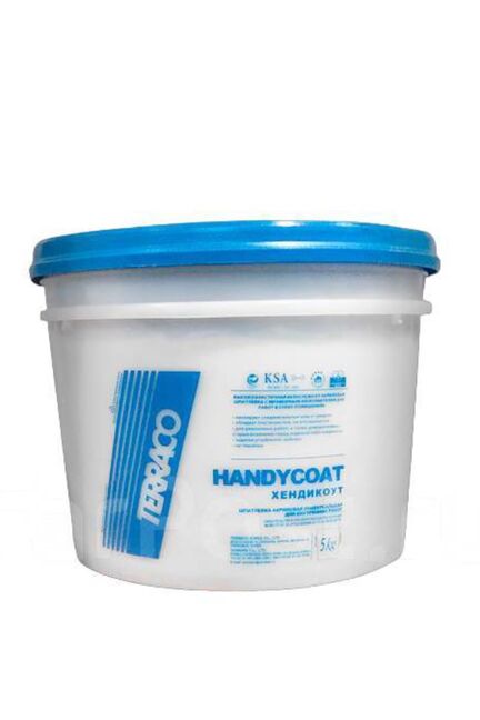 HANDYCOAT (Террако) - готовая к применению, универсальная высокоукрывистая, акриловая шпатлёвка для внутренней отделки. Это стандартный сорт для стандартных целей, подходит для любых работ кроме специализированных. Можно применять на большинстве строительных поверхностей, включая дерево. Хэндикоут специально предназначен для ремонта и восстановления внутренних поверхностей, как старых, так и новых, перед покраской. Хэндикоут заполняет стыки, тонкие трещины и т.д., обладает пластическими свойства Шпатлевка "Хэндикоат" Terraco 5 кг (Корея) – акриловый состав для выравнивания стен и потолков. Готова к применению, быстро сохнет, экологичная.