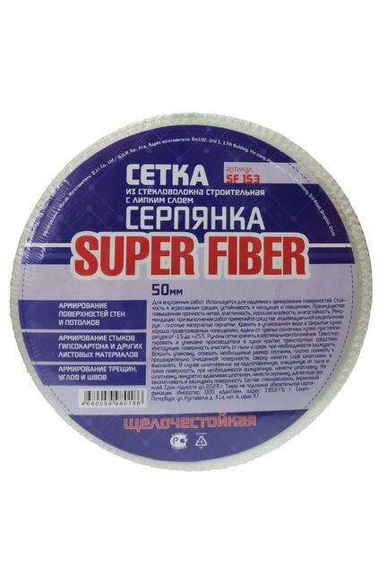 Серпянка — это лента, представляющая собой систему переплетенных стекловолокон. Серпянка имеет сетчатую структуру, что позволяет избегать попадания под ленту воздуха и образования вздутий и неровностей. Сетчатая структура покрыта равномерным слоем клея постоянной липкости, что позволяет качественно, быстро и технологично выполнять работы с ее использованием даже непрофессионалам. Применяется для внутренних работ, для армирования стыков гипсокартона, ДСП, оргалита и других листовых материалов, для армирования мест примыкания дверных и оконных коробок к стенам, для армирования трещин, углов и швов бетонных и оштукатуренных поверхностей, для армирования поверхностей стен и потолков. Прочная стекловолоконная сетка-серпянка 50 мм х 153 м для надёжного армирования швов и защиты от трещин при отделочных работах.