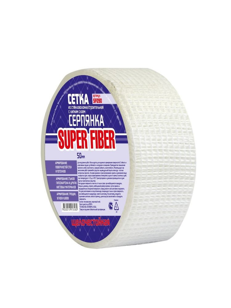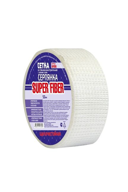 Серпянка — это лента, представляющая собой систему переплетенных стекловолокон. Серпянка имеет сетчатую структуру, что позволяет избегать попадания под ленту воздуха и образования вздутий и неровностей. Сетчатая структура покрыта равномерным слоем клея постоянной липкости, что позволяет качественно, быстро и технологично выполнять работы с ее использованием даже непрофессионалам. Применяется для внутренних работ, для армирования стыков гипсокартона, ДСП, оргалита и других листовых материалов, для армирования мест примыкания дверных и оконных коробок к стенам, для армирования трещин, углов и швов бетонных и оштукатуренных поверхностей, для армирования поверхностей стен и потолков. Стекловолоконная сетка 50×90 м Super Fiber: влагостойкая, прочная, с клеевым слоем для лёгкой фиксации и защиты швов от трещин.