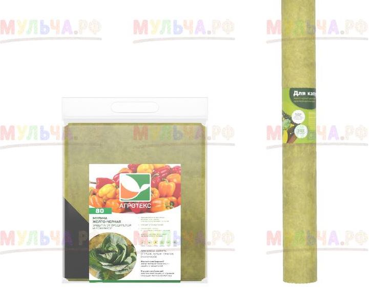 Желто - черный мульчирующий материал От вредителей и сорняков. ЖЕЛТЫЙ СЛОЙ обеспечивает защиту от вредителей без применения химикатов, привлекая их на материал. Защищает стебель, листья и плоды от контакта с землей. ЧЕРНЫЙ СЛОЙ (внутренний) поглощает солнечный свет, позволяет поддерживать оптимальную температуру для прогрева почвы весной, а также сдерживает рост сорняков. Двухцветная мульча защищает от сорняков, удерживает влагу, пропускает воздух и легко стелется для садовых и строительных нужд.