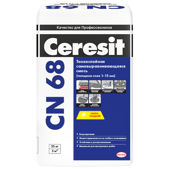 Самовыравнивающаяся смесь Ceresit CN 68 предназначена для выравнивания бетонных, цементно-песчаных, ангидритных и гипсовых горизонтальных оснований под укладку керамических плиток, линолеума, ковролина, ламината и других напольных покрытий, кроме паркета, в сухих помещениях с низкими механическими нагрузками (жилых, бытовых, административных, общественных и т.п.). Может применяться на основаниях с пониженной прочностью. Предназначена как для ручного, так и для механизированного нанесения. Смесь можно наносить слоем толщиной от 1 до 15 мм. Самовыравнивающаяся смесь для пола, слой 1-15 мм, быстрое схватывание, минимальная усадка, готова к отделке через сутки, подходит для «тёплого пола».