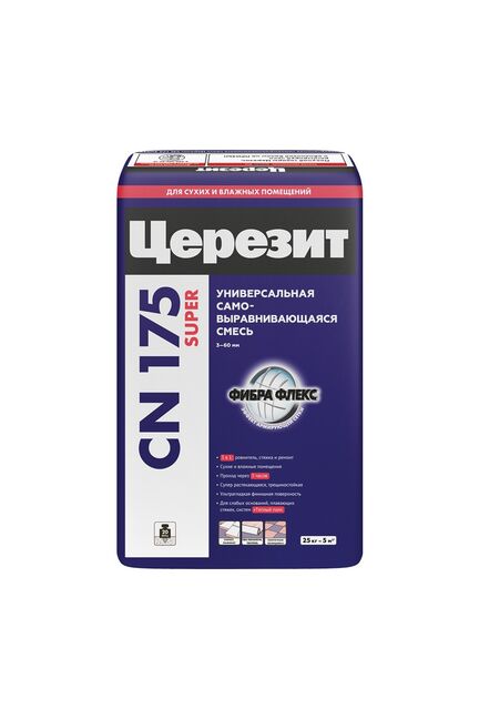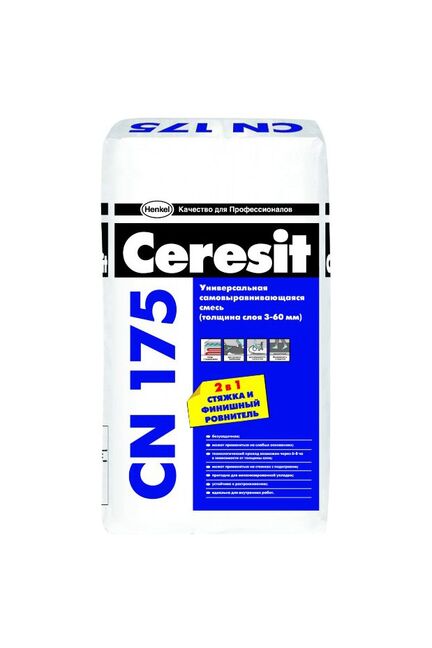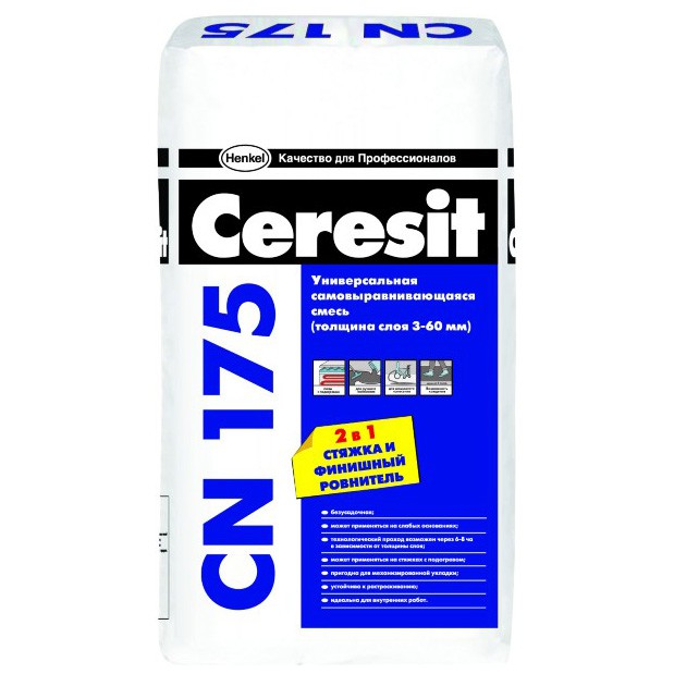 Самовыравнивающаяся смесь CN 175 предназначена для выравнивания бетонных, цементно-песчаных, ангидритных и гипсовых оснований пола под укладку керамических плиток, линолеума, ковролина, ламината и т.п. напольных покрытий, а также для изготовления и ремонта стяжек, связанных с основанием, в сухих помещениях с низкими механическими нагрузками (жилых, бытовых, административных и т.п.). Пригодна как для ручного, так и для механизированного нанесения. За один проход смесь можно наносить слоем толщиной от 3 до 60 мм. Быстросхватывающаяся смесь для ровного пола, подходит под любые покрытия, слой 2–20 мм, высокая прочность и влагостойкость.