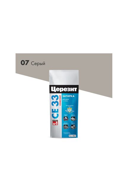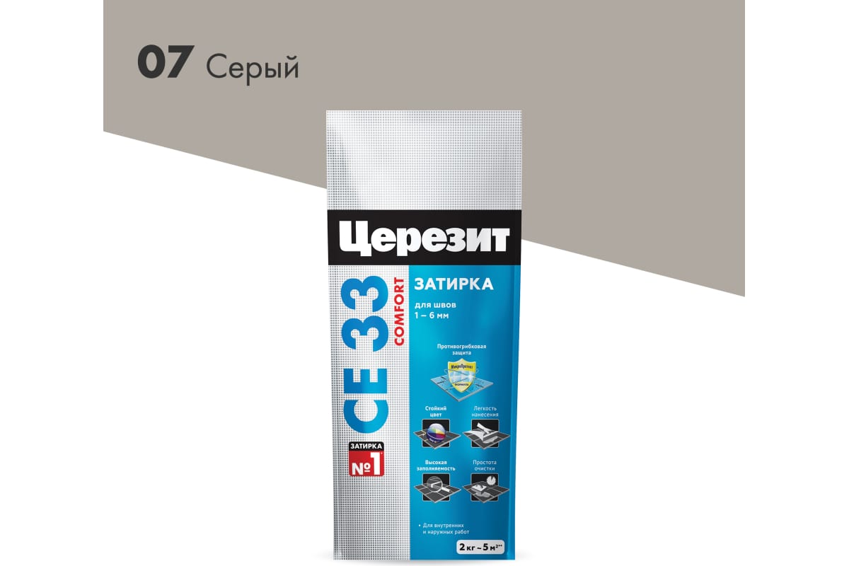 Герметичная затирка серого цвета для швов 2–5 мм, устойчива к влаге и грязи, легко наносится, идеальна для кухни и ванной, вес 2 кг.