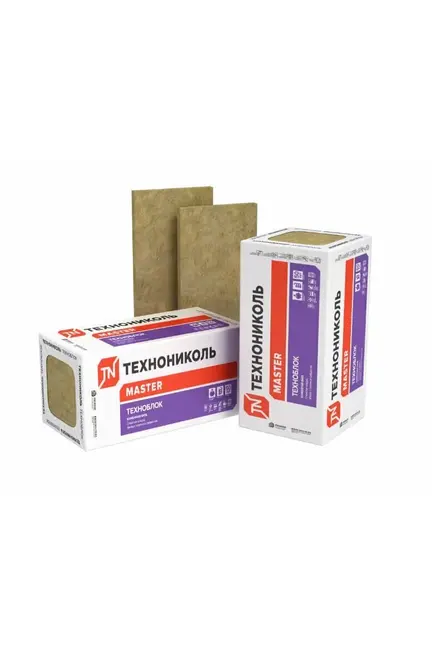 Материал используется в качестве утеплителя в ненагружаемых вертикальных и наклонных конструкциях: слоистая кладка, каркасных стенах, мансардах, перегородках, чердачных перекрытиях. ТЕХНОБЛОК также применяют в устройстве полов по лагам. Плотность 45 кг/м3. Тепло- и звукоизоляция, негорючий, устойчив к влаге, прост в монтаже, 6 плит 1200×600×50 мм — для утепления стен и перекрытий.