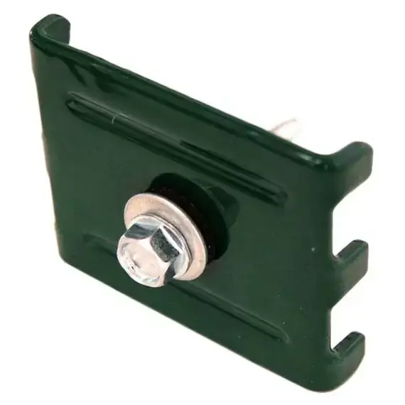 Для фиксации панели к столбу можно использовать крепления: металлическую скобу-саморез. Эти крепления просты в монтаже и не требуют наличия отверстий в столбе. Саморез 5,5х32 мм RAL 6005 для заборных секций из стали с антикоррозийным покрытием. Самосверлящий, цвет "зеленый мох", для профлистов до 5 мм.