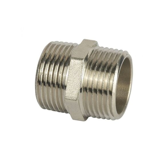 Латунный бочонок Ду 20 с никелированием для прочных герметичных соединений труб, устойчив к коррозии и высоким температурам, резьба 3/4 дюйма.