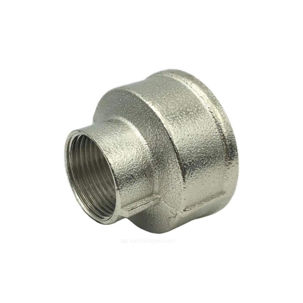 Латунно-никелированная муфта 25х15 мм надежно соединяет трубы разного диаметра, устойчива к коррозии, подходит для систем отопления и водоснабжения.