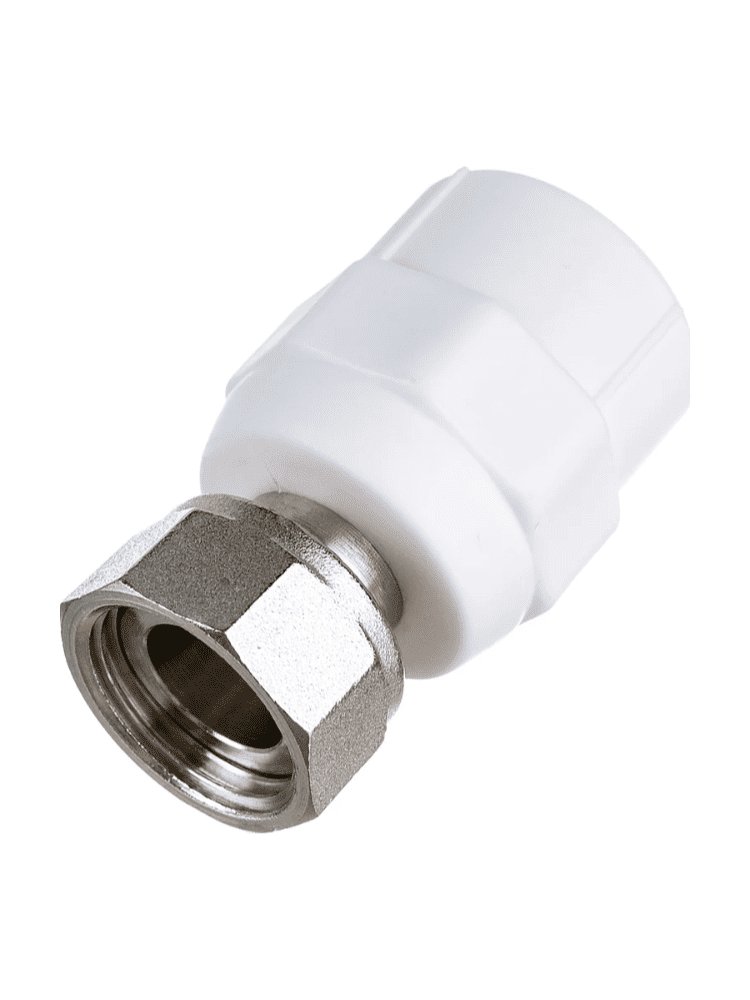 Удобный соединитель с накидной гайкой для PPR-труб 20 мм и резьбы 1/2'', быстрое разборное соединение, стойкость к высоким температурам и давлению.
