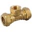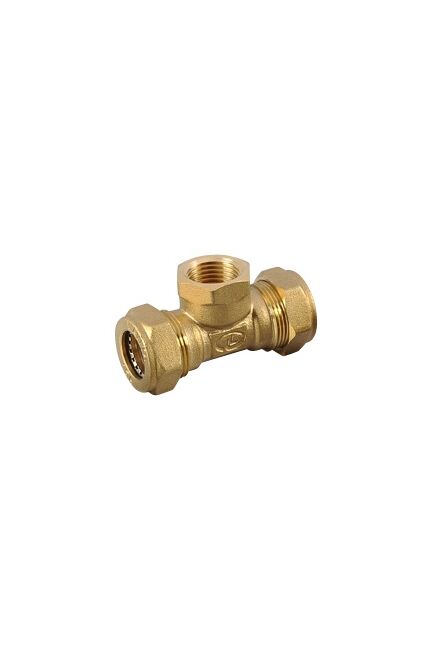 Тройник обжимной латунный 15×1/2"×15 мм для надёжного соединения водопроводных труб, подходит для холодной и горячей воды, прост в монтаже.