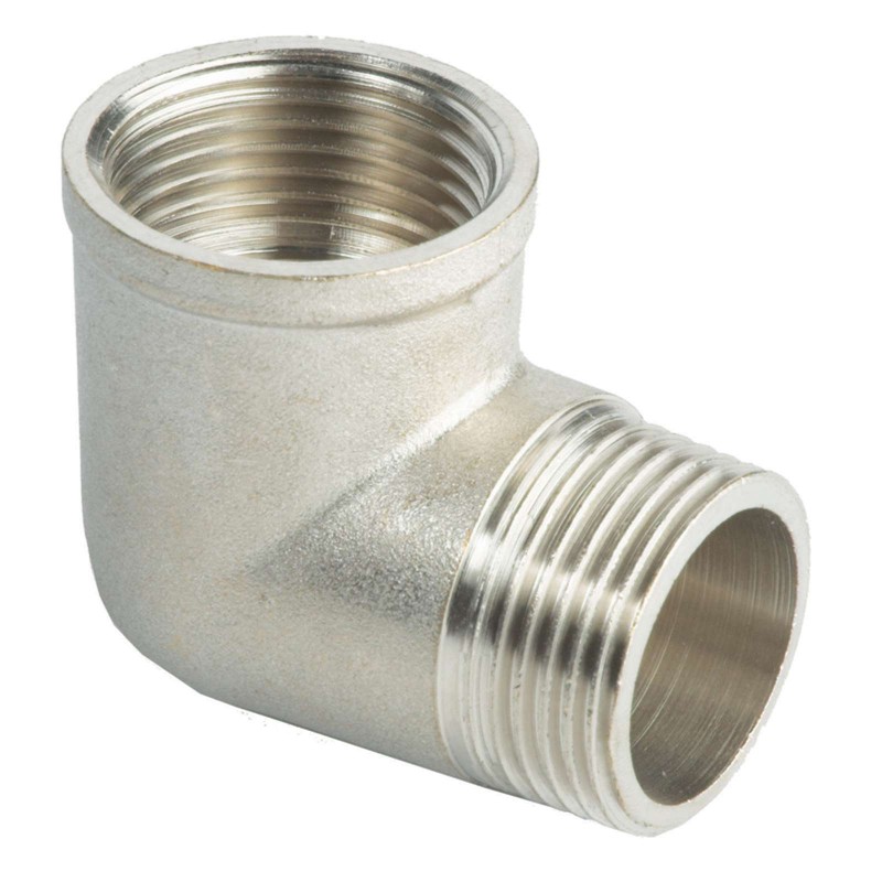 Латунный уголок 15 мм ВР-НР с никелем и буртом, устойчив к коррозии, предназначен для прочных и герметичных соединений труб.