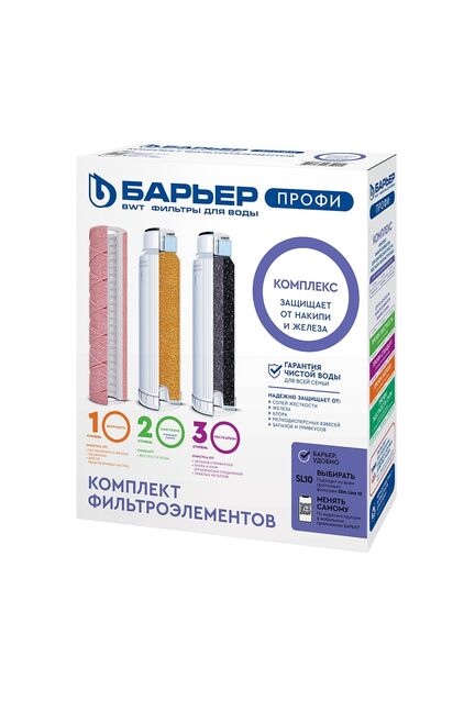Набор сменных картриджей "Профи Complex" предназначен для замены кассет одноименной трехступенчатой системы фильтрации воды от компании "Барьер" после окончания срока их службы (от нескольких месяцев до 1 года в зависимости от состояния исходной воды). Вместе три кассеты очистят воду от всевозможных загрязнений и примесей, от железа, хлора, тяжелых и токсичных металлов, смягчат воду без эффекта "гиперумягчения", произведут кондиционирование воды, то есть улучшение ее запаха и избавление от неприятного привкуса. В состав набора входят следующие кассеты: "Профи Ферростоп", "Профи Смягчение" и "Профи ПостКарбон", каждая из которых выполняет свою роль в очищении, смягчении и последующем кондиционировании воды. Все сменные картриджи легко устанавливаются и не требуют применения специальных инструментов. Комплексная фильтрация холодной воды, удаление механических примесей, хлора и металлов. Для квартиры, дома и офиса. Простая установка.