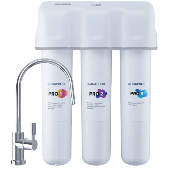 Cистема для глубокой очистки воды от химических примесей, бактерий, ржавчины и других растворенных и механических загрязнений. Многоступенчатая фильтрация ECO Pro включает инновационный модуль предочистки 2 в 1 с увеличенным ресурсом, сорбционные карбонблоки во всех трех картриджах и ультрафильтрационную половолоконную мембрану. Система оснащена новым коллектором с дополнительным уровнем безопасности. Абсолютная антибактериальная защита обеспечивается без применения химических бактерицидов. На стадии ультрафильтрации половолоконная мембрана удаляет бактерии и цисты микроорганизмов, некоторые из которых устойчивы к хлору и кипячению. Модель ECO Pro cохраняет исходный минеральный состав воды. Трёхступенчатая система фильтрации, до 8000 л ресурса, удаляет бактерии и примеси, быстрый монтаж и лёгкая замена картриджей.