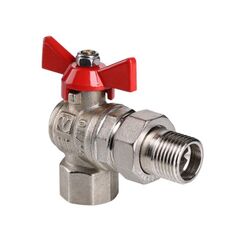Угловой полнопроходной ремонтопригодный шаровой кран с увеличенным ресурсом. Соединен накидной гайкой с резьбовым полусгоном. Корпуса деталей – латунные, никелированные. Кран оснащен ручкой типа «бабочка» с утолщенной стенкой из алюминиевого сплава и эпоксидным покрытием красного цвета. Резьба присоединений – внутренняя/наружная Латунный угловой кран PN40 с никелированием, американка ВР-НР 3/4 дюйма, быстрая установка, устойчив к коррозии, для отопления и водоснабжения.